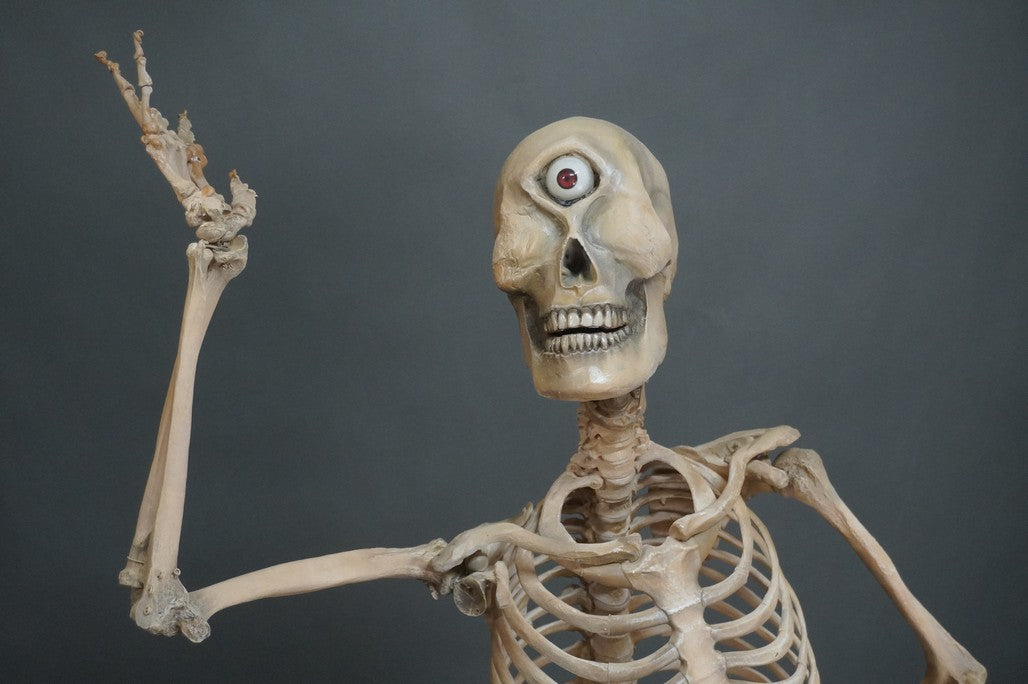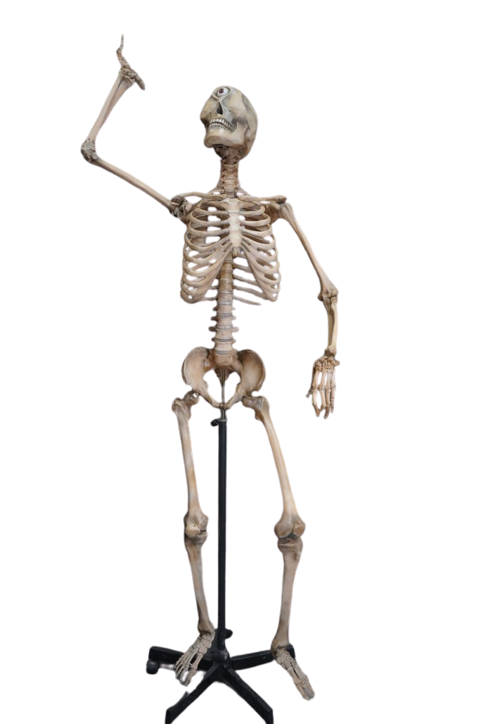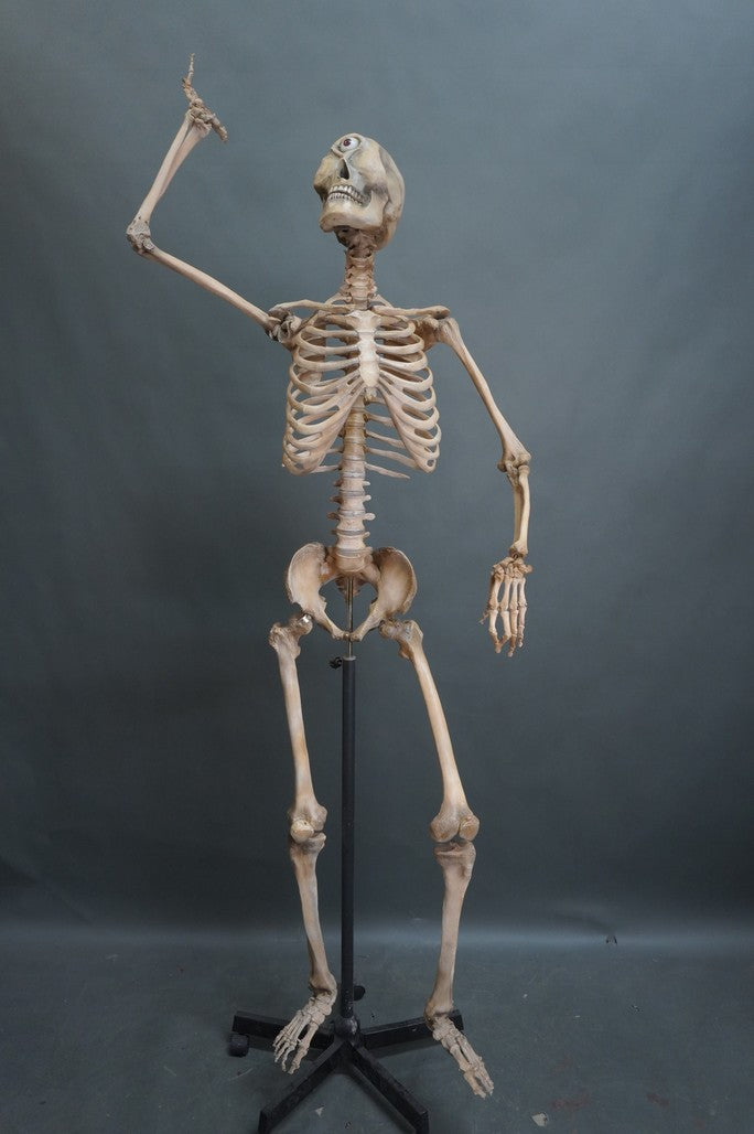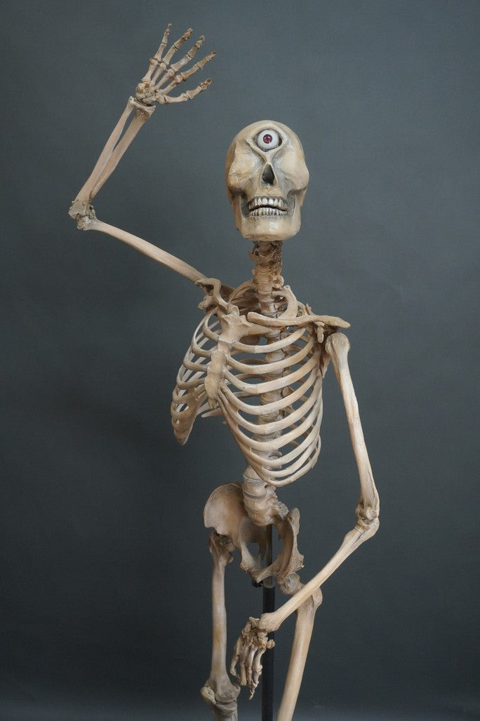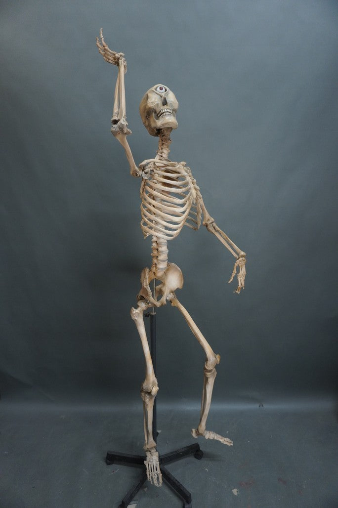 5.5ft tall standing adult cyclops skeleton with with poseable arms, an eyeball and removable stand. Eye color may vary.