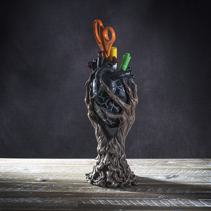 Features a hollow, black heart cradled in the branches of a tree with the face of the Green Man– a folk legend seen as a symbol of life, death, and rebirth.