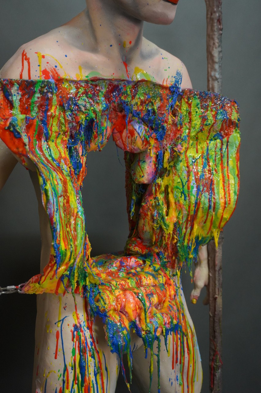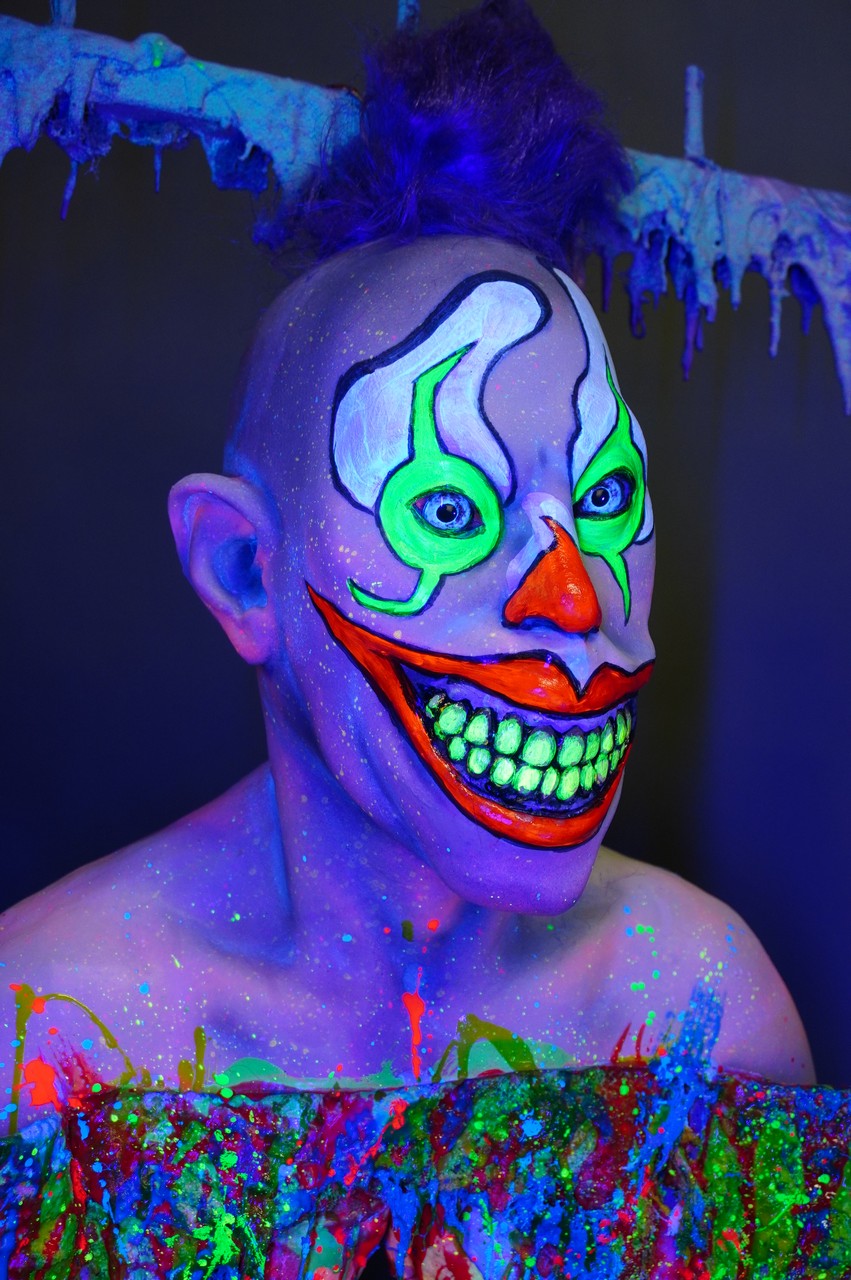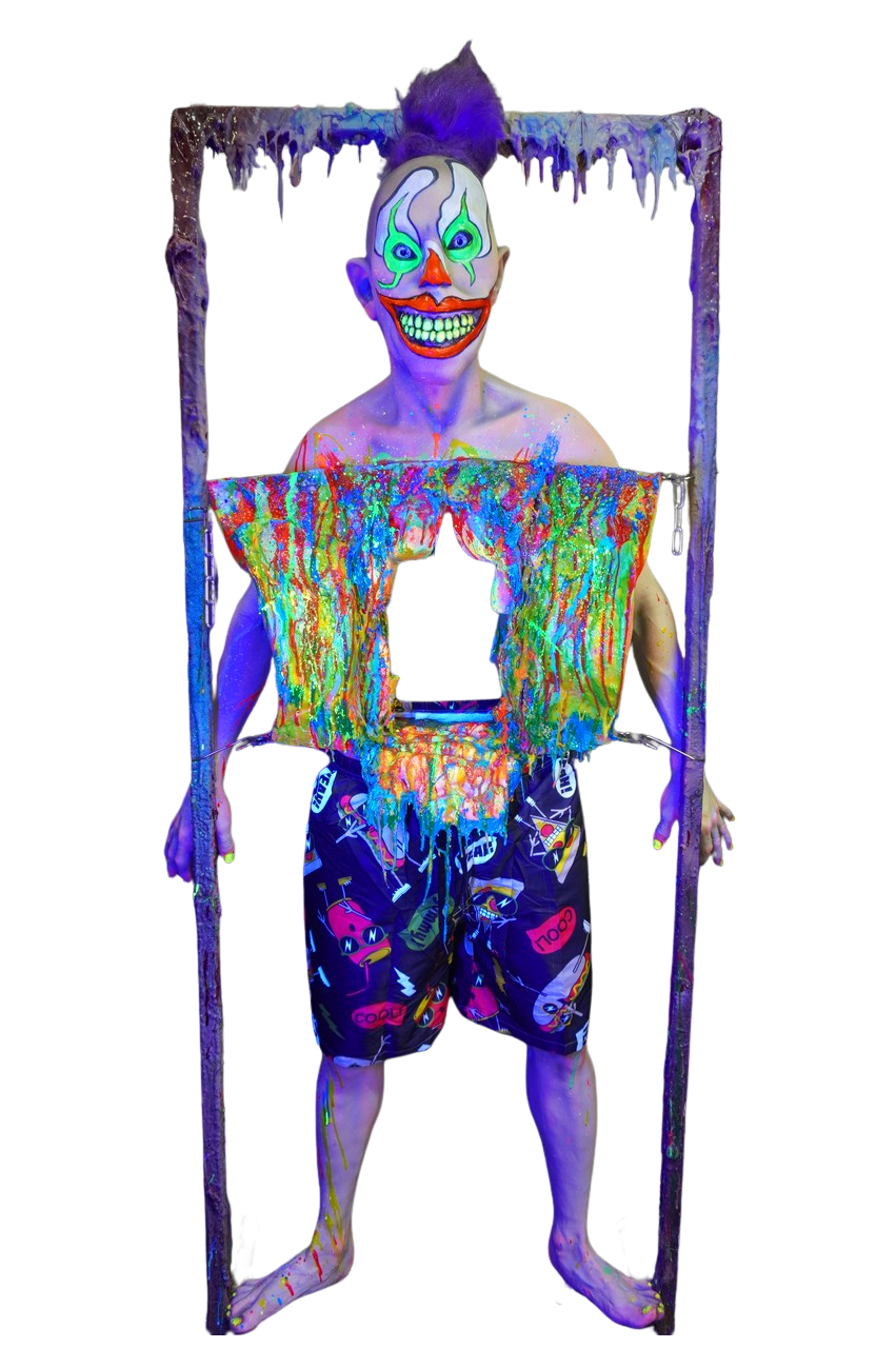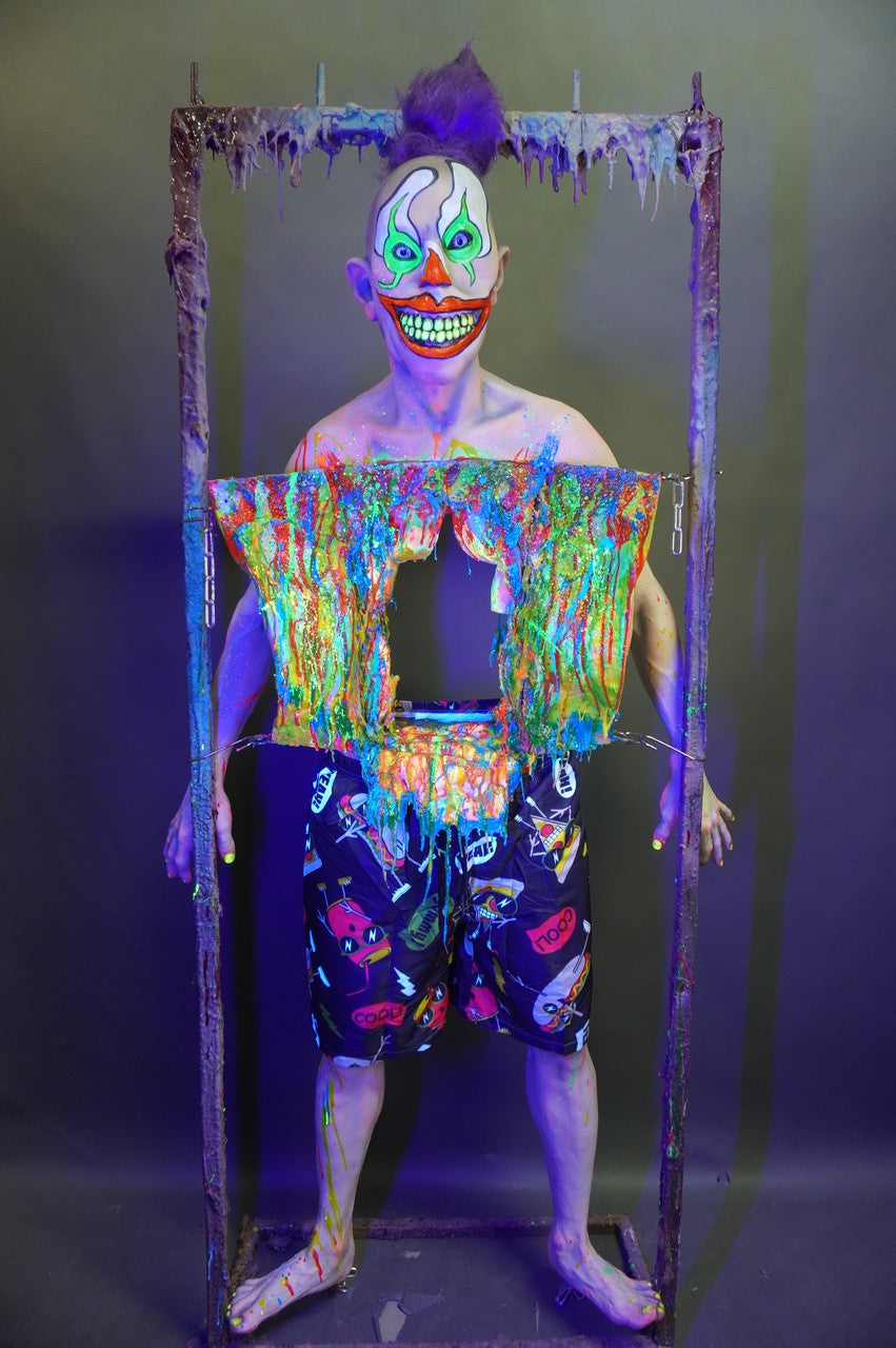 Dura Autopsy Jack Body with Gutters the clown head, movable flaps in front and an opening in the back allowing props and small actors to pass through. With multi-colored confetti style clown guts. Glows in blacklight. Can be used as a photo op hanging up or laying down on a trick table.