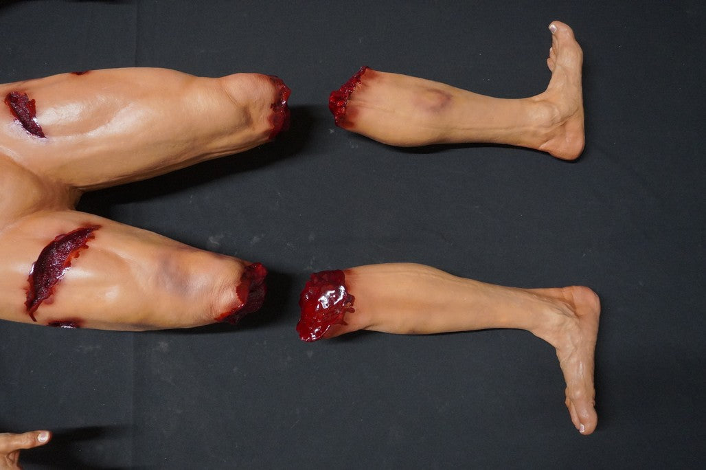 Lifecast Jack body with realistic wounds depicting dismembered legs as may occur in a bomb blast or vehicular accident. Made with durable rubber skin and polyfoam. With facial hair and eyebrows. Shipping Dimensions: 72" x 24" x 12"