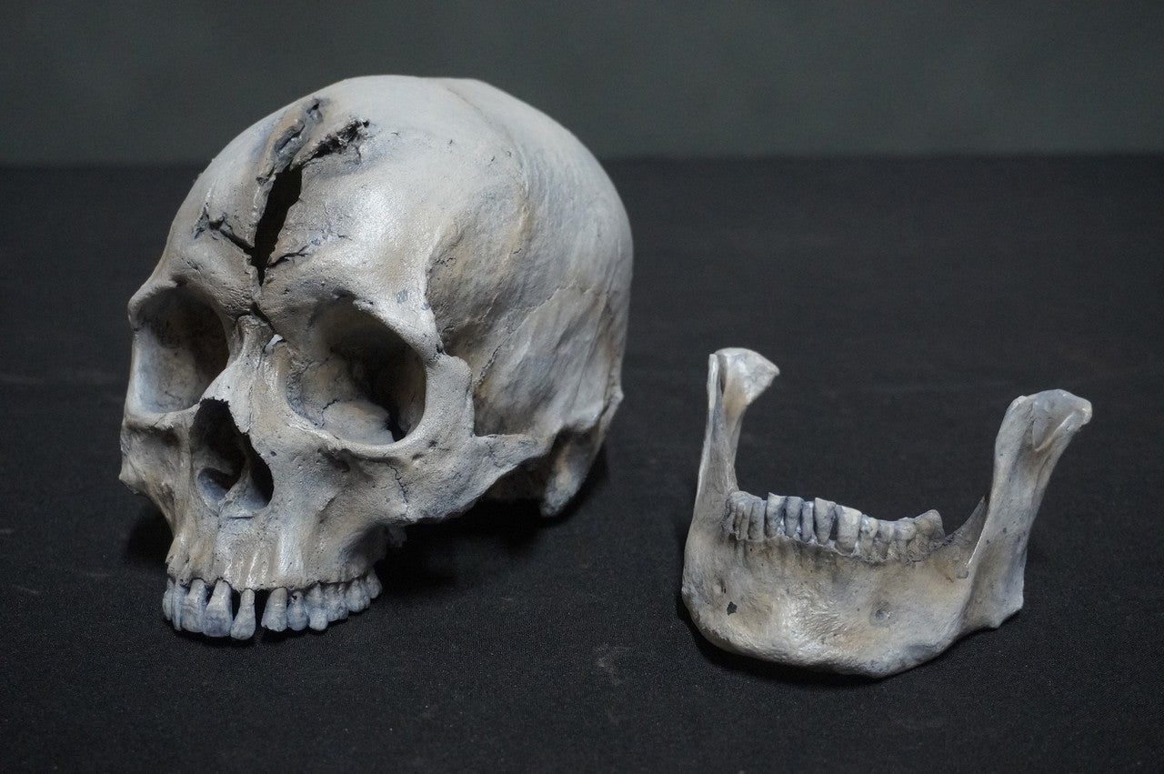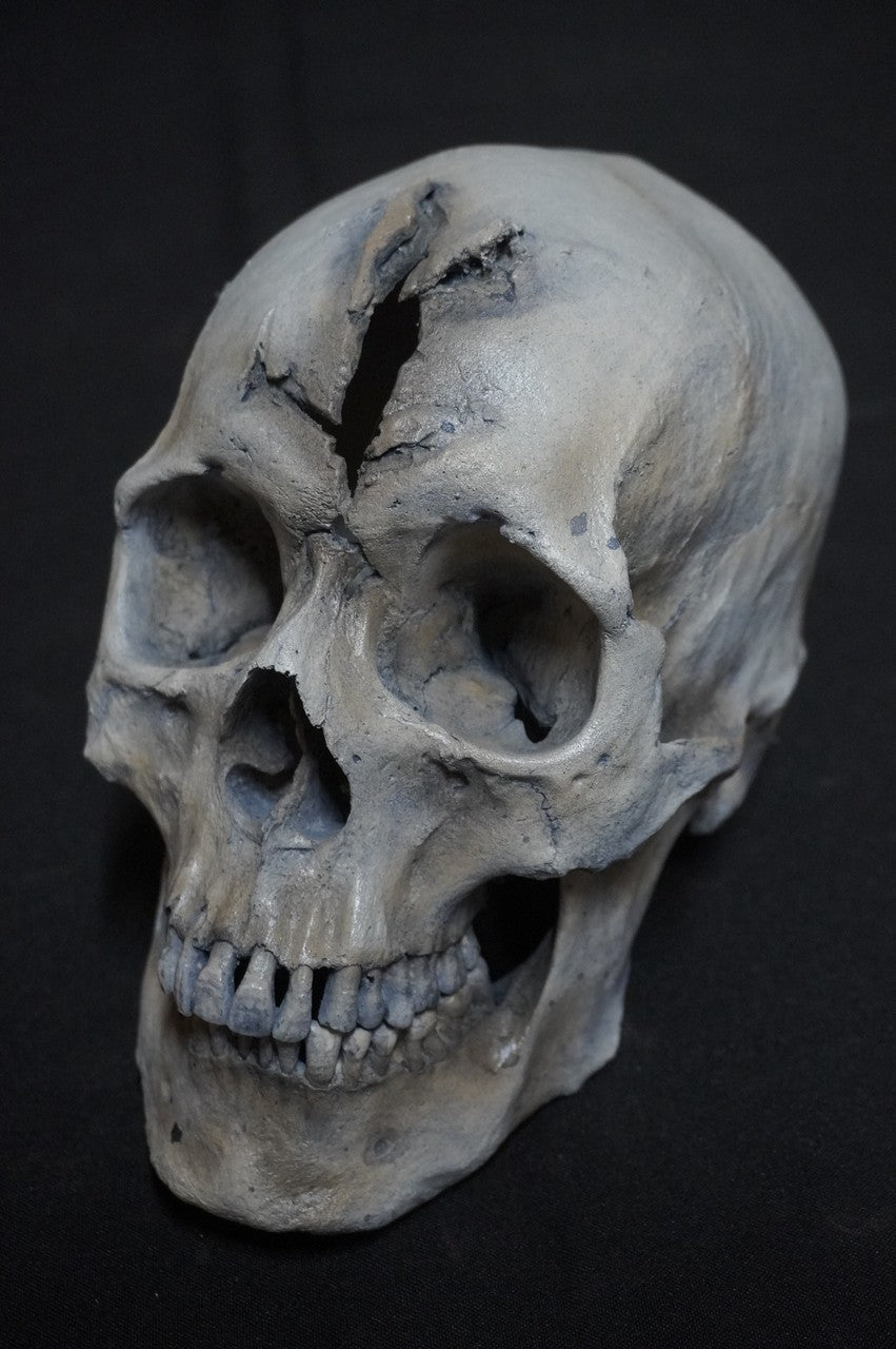 Our male human skull "Henning," is a lifecast, high detail, replica human skull with sharp force trauma illustrating a sword or knife stab into the forehead.