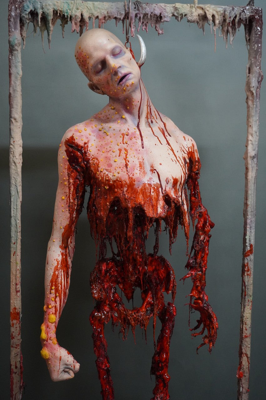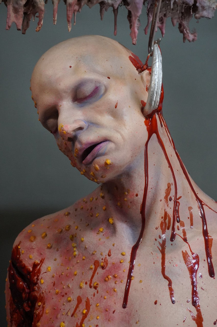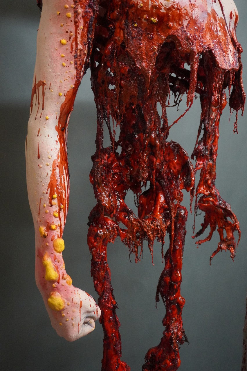 A gory meat skeleton with partially intact head and gory upper body. Can hang from the top of the head, sit, lay down or be put on a stand. Blacklight responsive blisters and gore. Made of polyfoam rubber and PVC. Truly creepy haunted house prop. Hanging stand not included