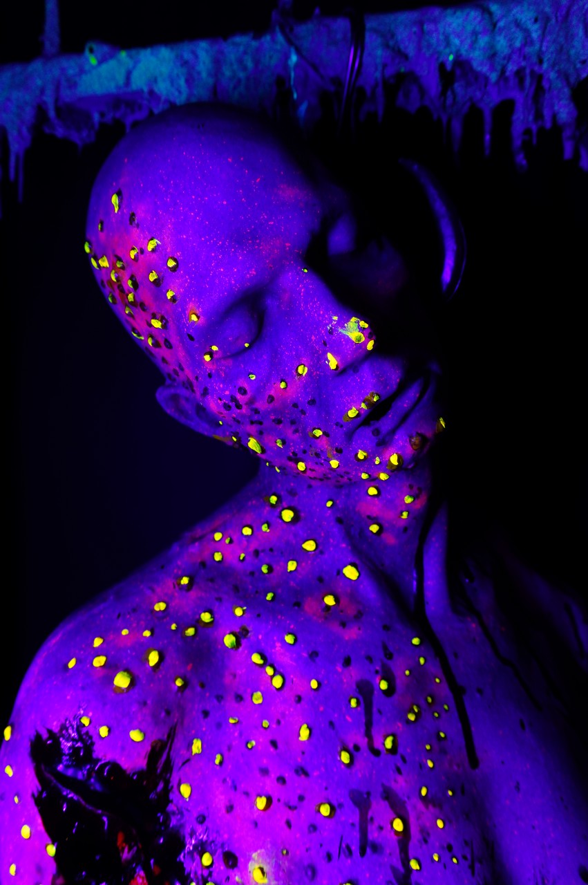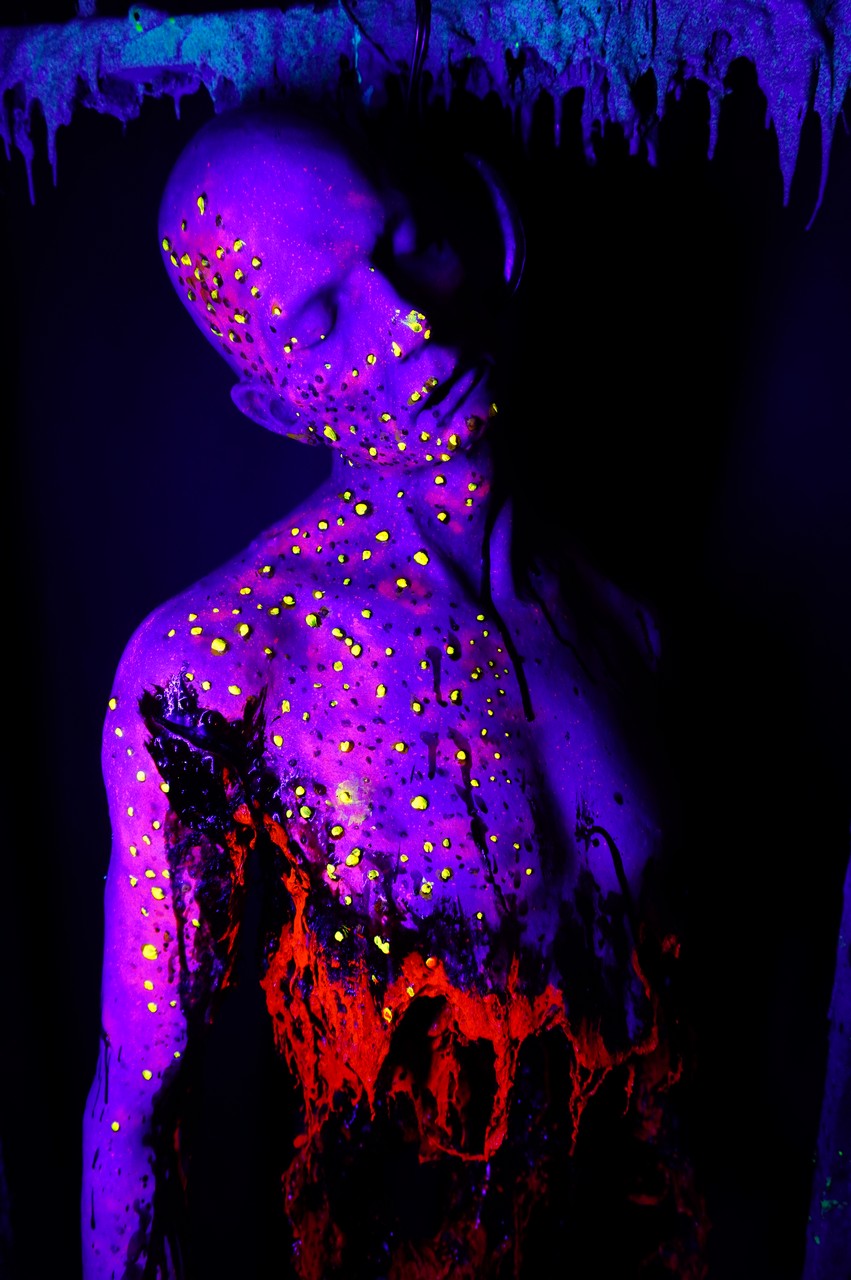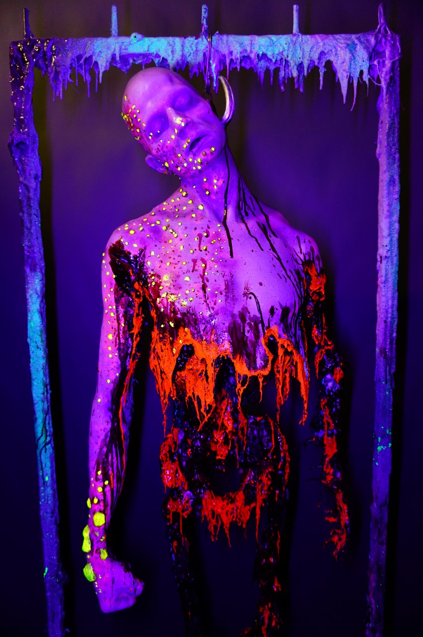 A gory meat skeleton with partially intact head and gory upper body. Can hang from the top of the head, sit, lay down or be put on a stand. Blacklight responsive blisters and gore. Made of polyfoam rubber and PVC. Truly creepy haunted house prop. Hanging stand not included