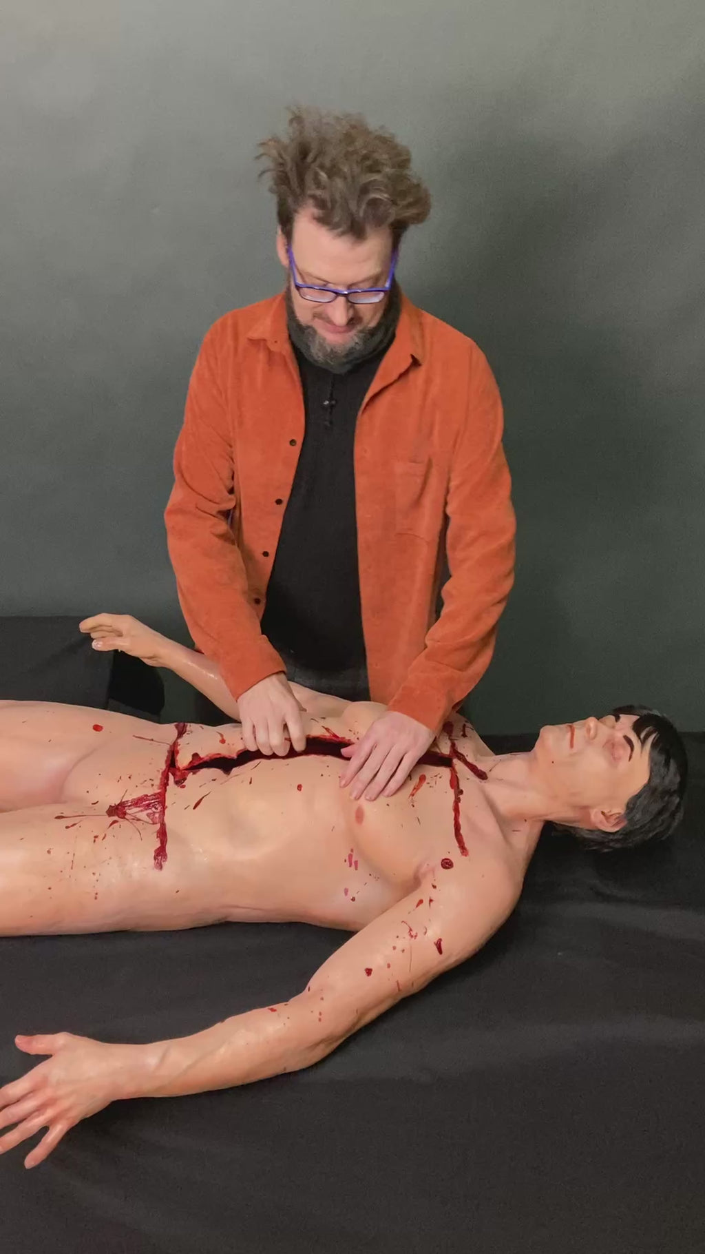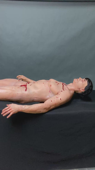 Realistic putrid female cadaver with open eyes and mouth. Full body, flat back prop. Realistic autopsy incision with hollow open chamber so that actors or objects can be passed completely through the body. Cast in high strength dura rubber with reinforced flaps.