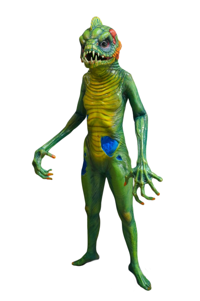Lifesize freestanding reptillian / amphibian lagoon creature. Works great in a variety of themed environments such as swamp, space, dinosaur, cave, and deep sea. Glows under UV blacklight.