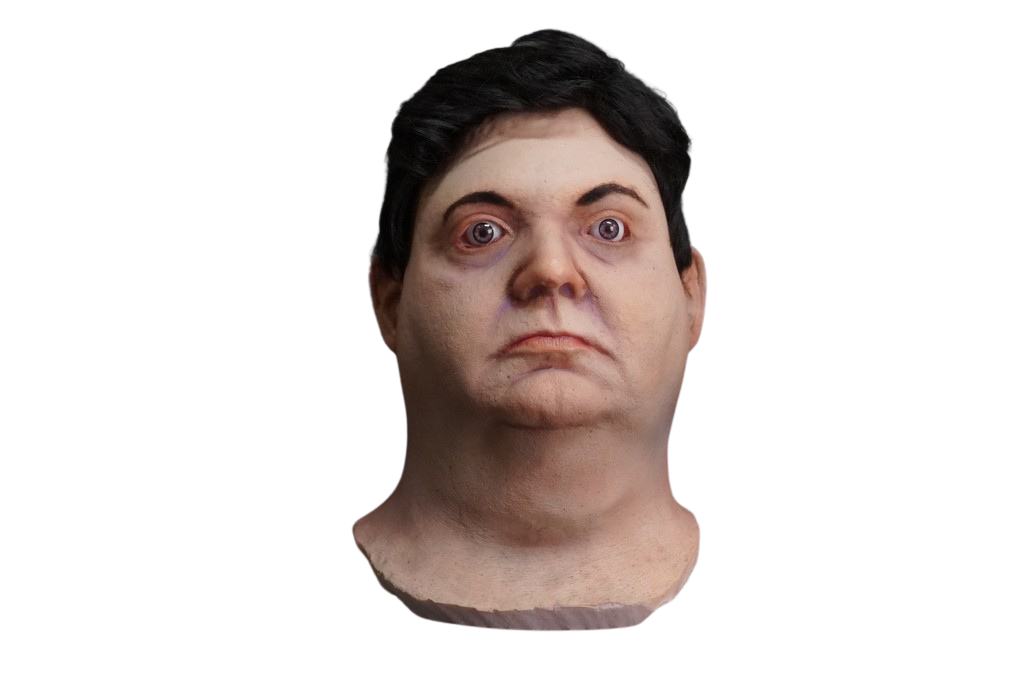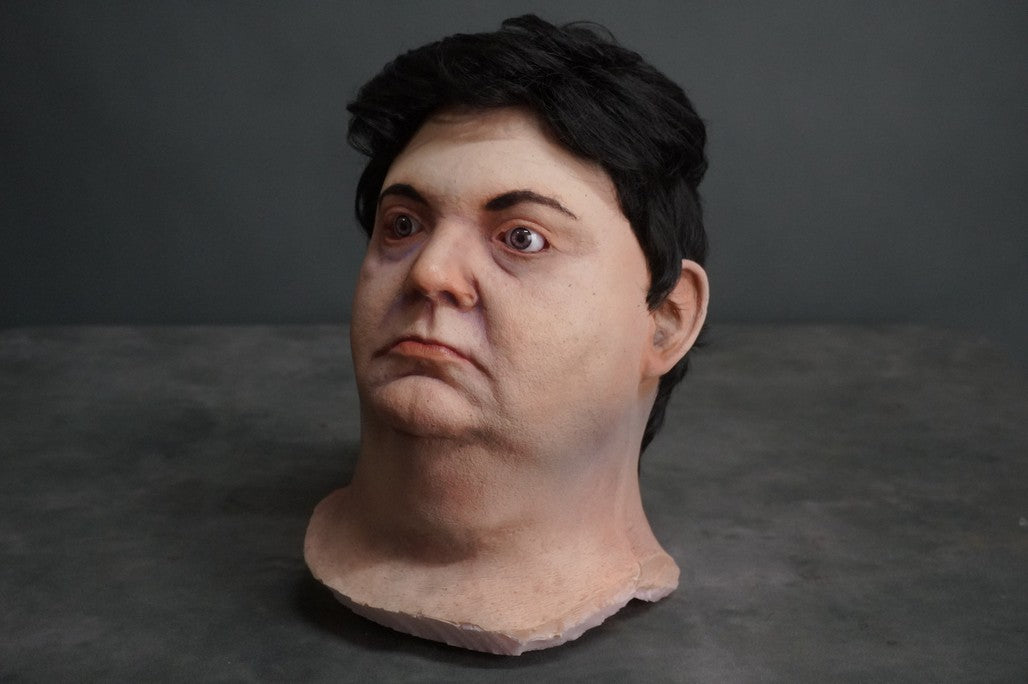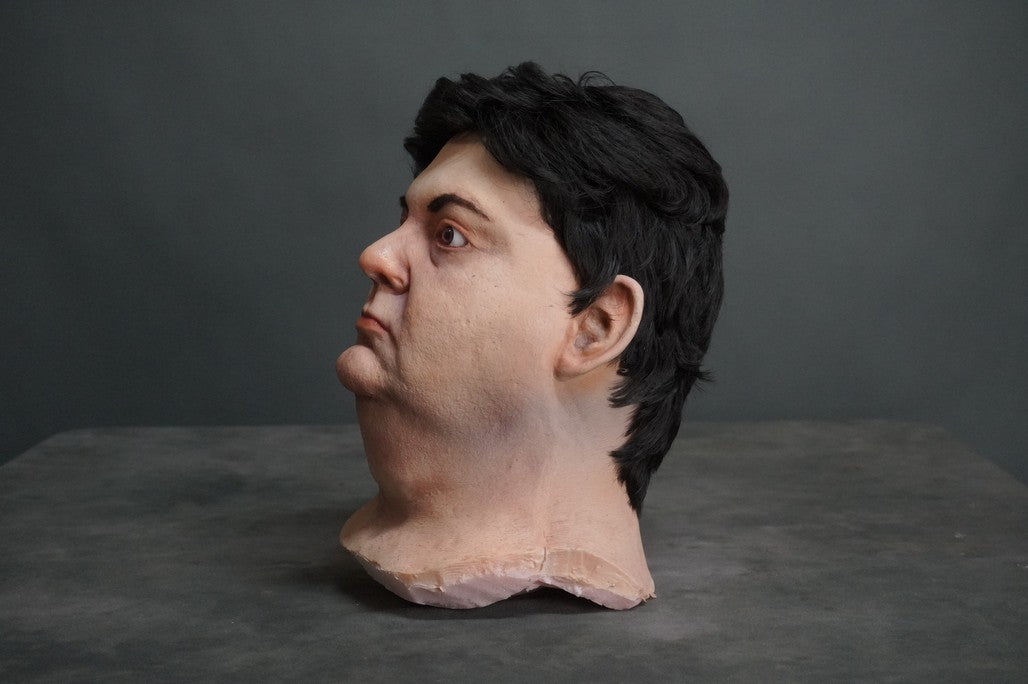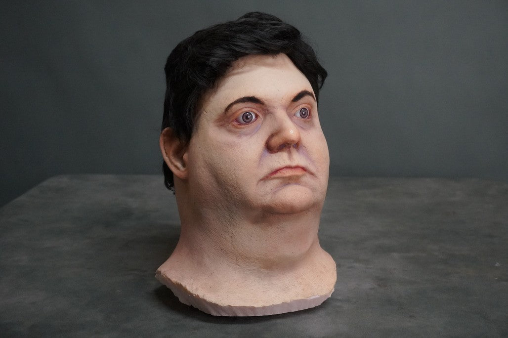 Life size, life cast heavy middle aged male head with eyes open and mouth closed.