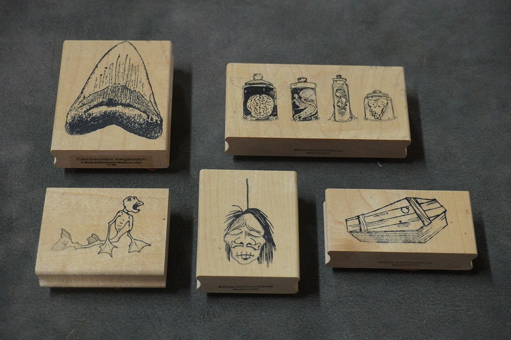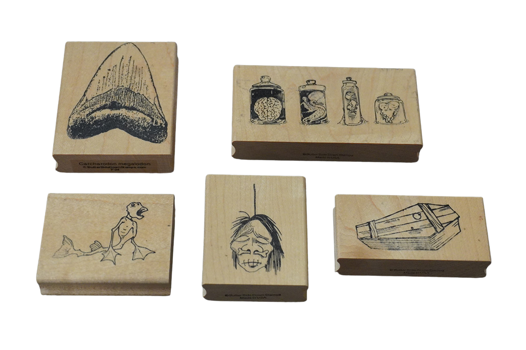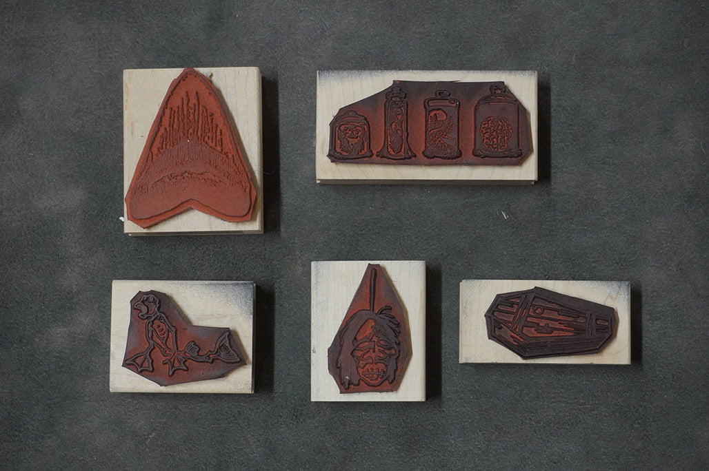 Collection of decorative stamps to make prints of hand-drawn oddities.