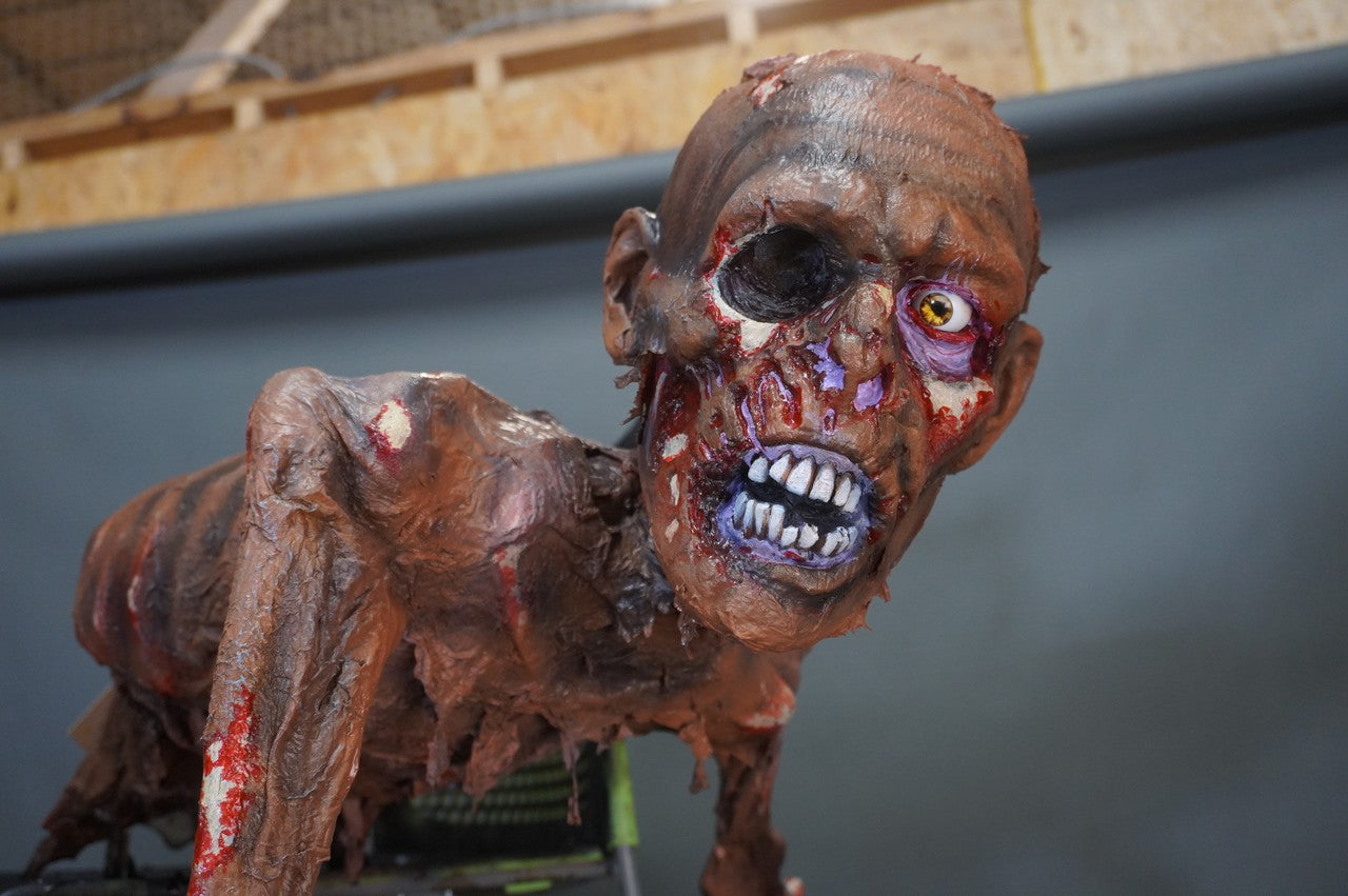 Our Mummies are made with a tear-resistant mesh infused latex skin that becomes wrinkled and leathery during fabrication. As such each mummy will have a slightly unique texture to its skin. The most mummies have some holes intentionally in the skin for added realism and to show some of the bones underneath.