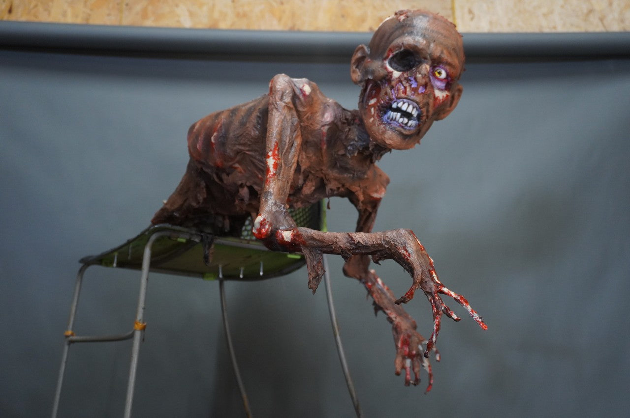 High detail mummified skeleton with Iggy head. Mummy is available with legs in a crawling position or without legs with the spine ending in steel brackets so it can be mounted on a wall, duct, or overhang. Mounted version is seen below mounted to a chair as a demo.