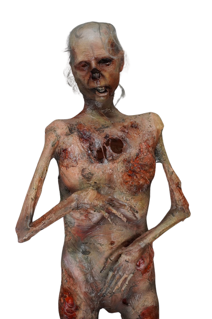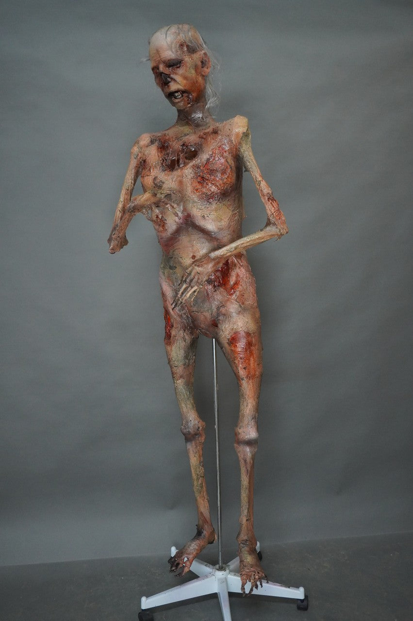 Putrid Hester shows advanced desiccation and skin slippage on a still somewhat fresh cadaver. Posed limbs and a removable stand.