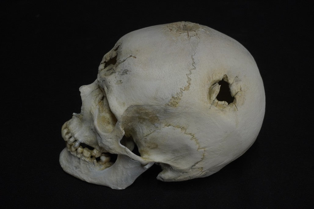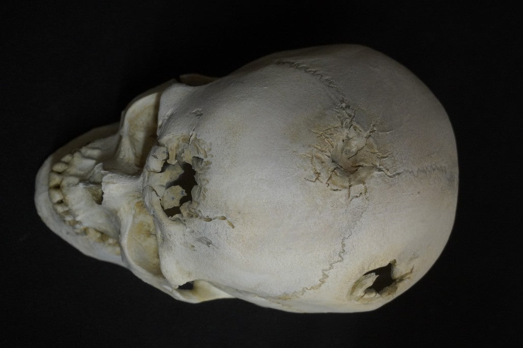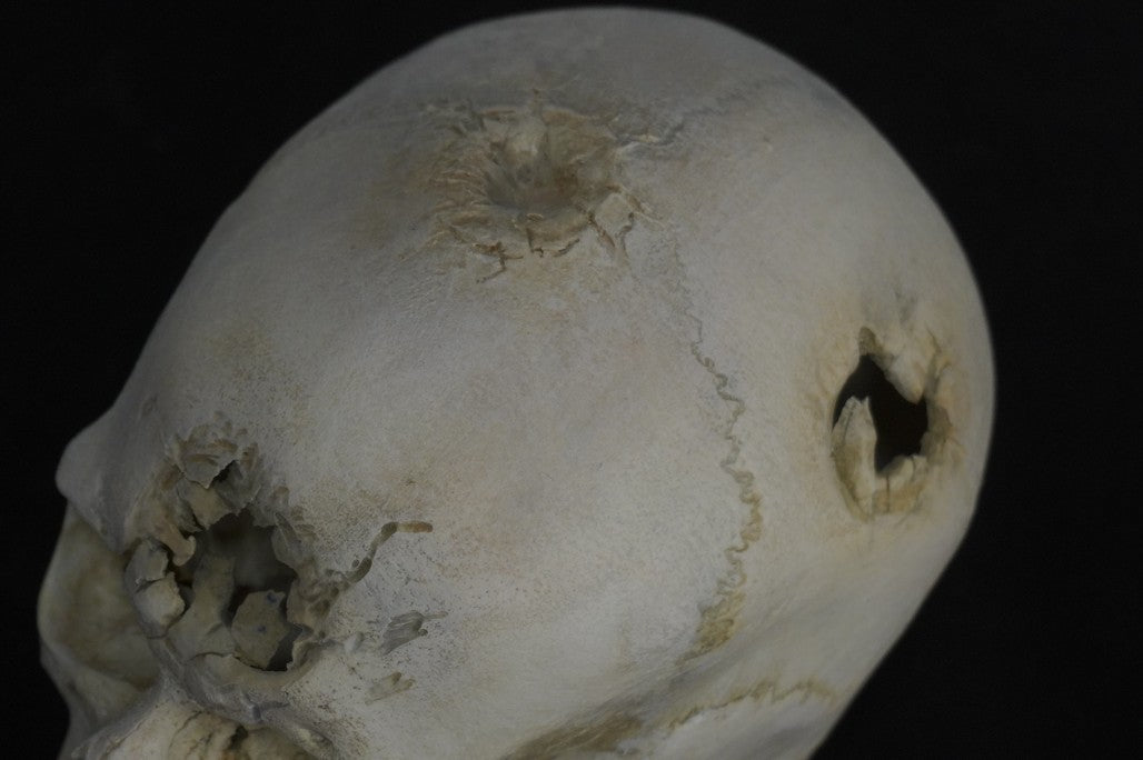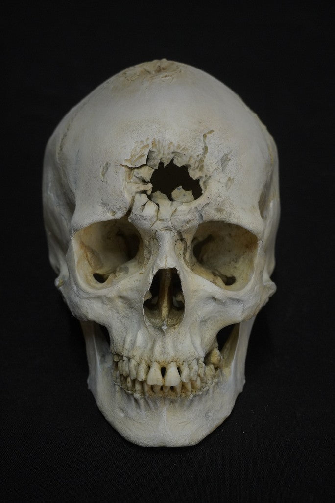 Our female human skull, Riley, is a lifecast, high detail, replica human skull illustrating various blunt force trauma depressions caused by hammer blows.