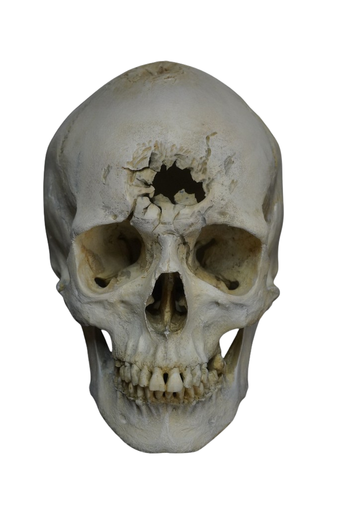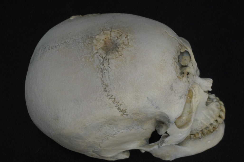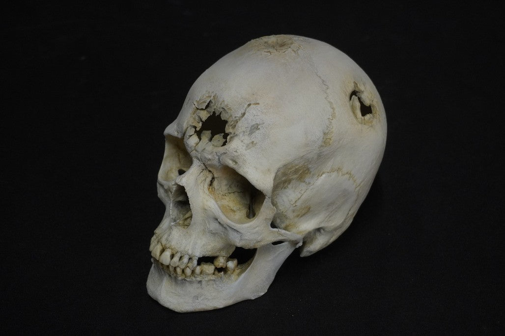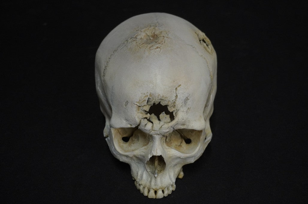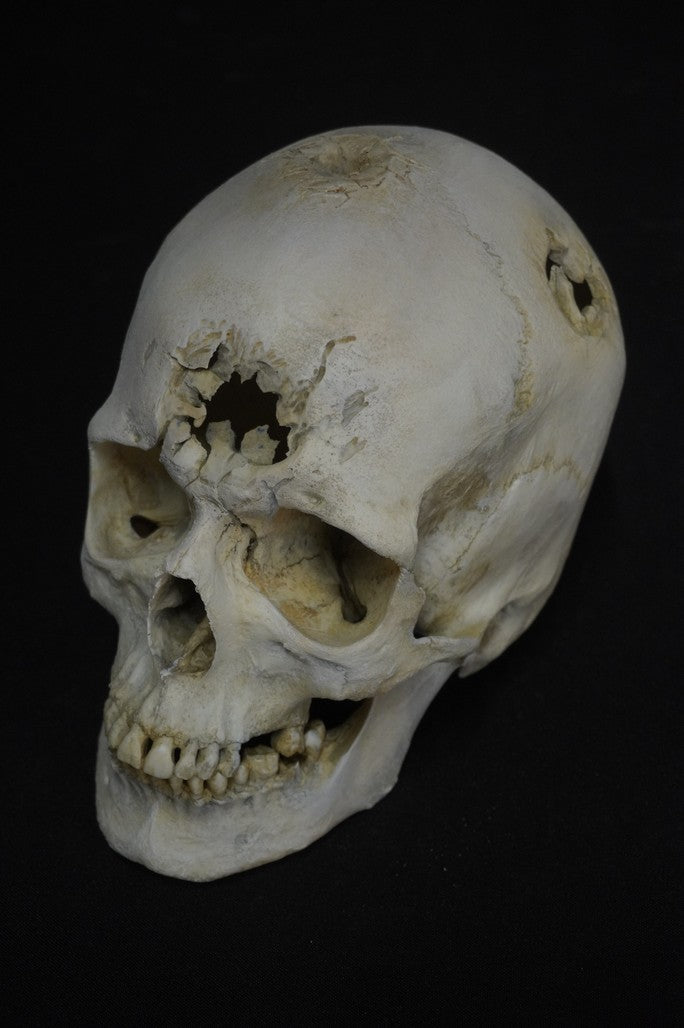 Our female human skull, Riley, is a lifecast, high detail, replica human skull illustrating various blunt force trauma depressions caused by hammer blows.