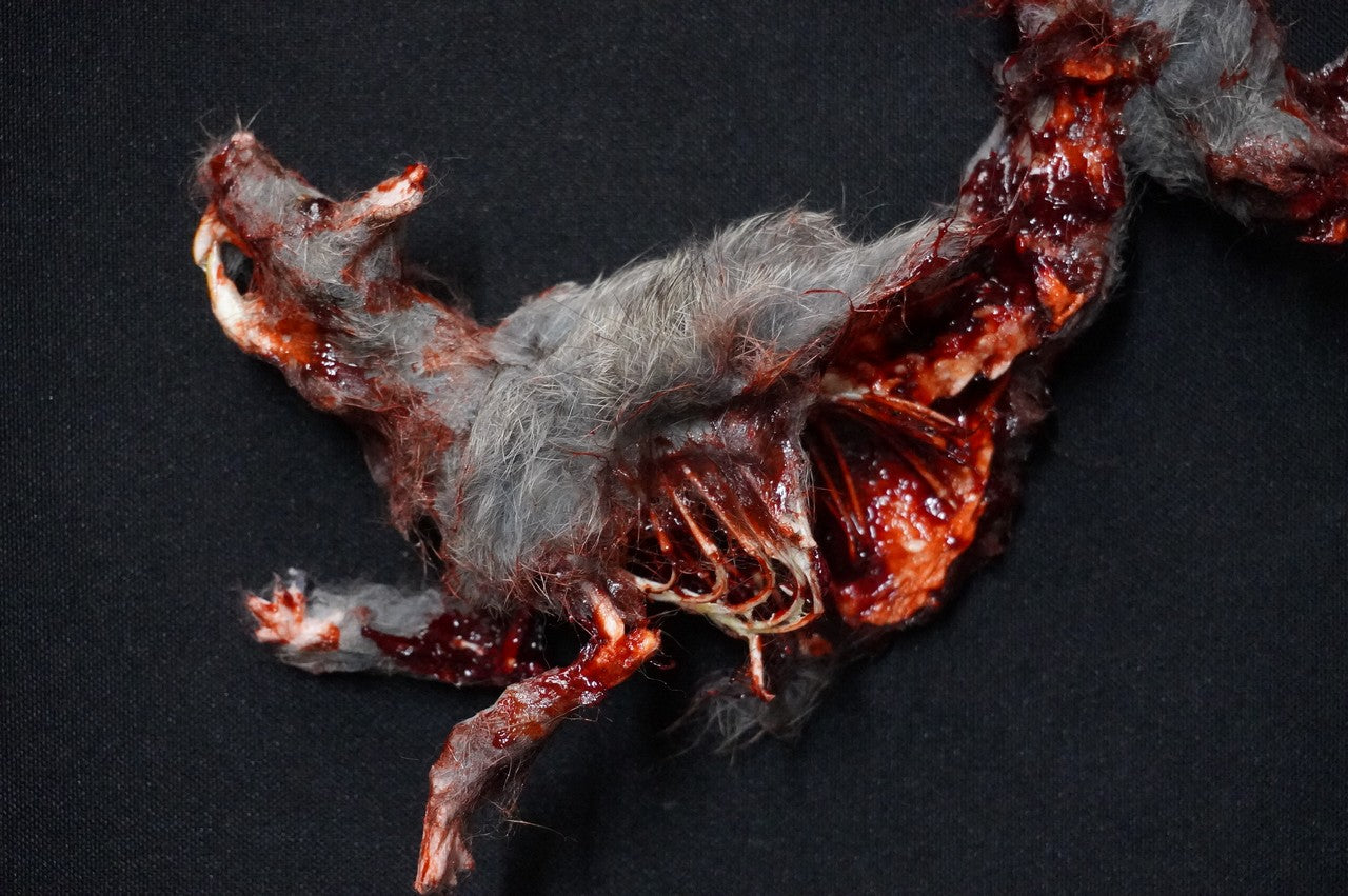 Realistic roadkill rat prop uses an authentic lab specimen skeleton with fur, foam rubber gore, face, tail, and feet. Each one is unique.