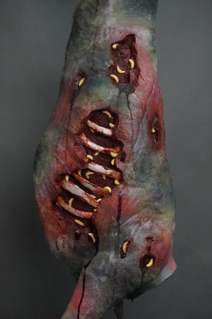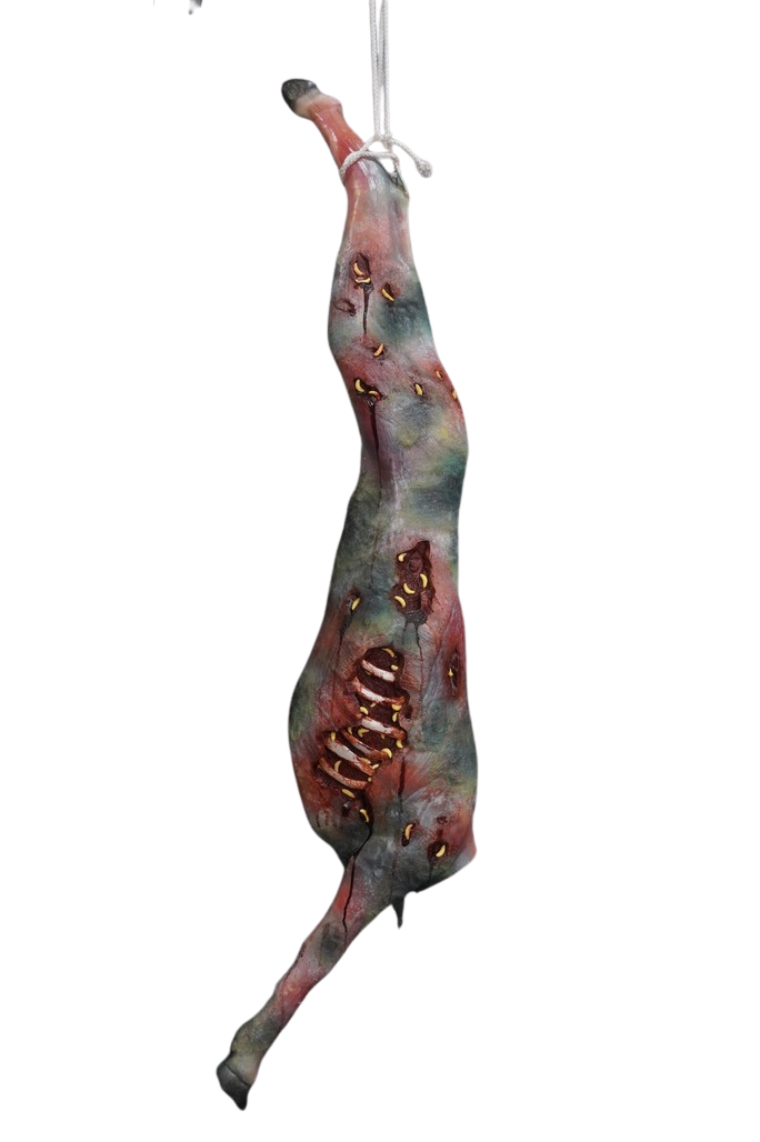 Hanging side of skinless, gory lifesize foam rubber goat split in half with no head. Hand painted with a rotted meat finish and replica maggots feeding on the exposed ribs. Includes embedded armature.