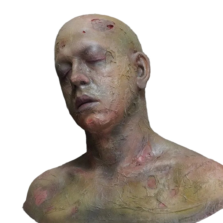 Life size, life cast male head with rotten skin texture and bloody decay.