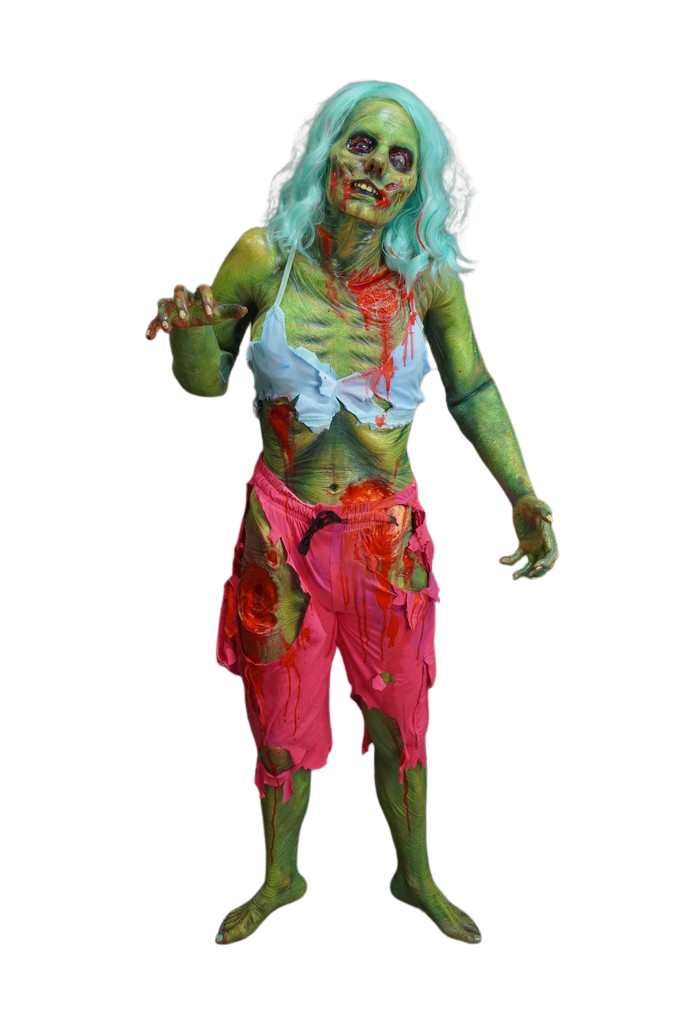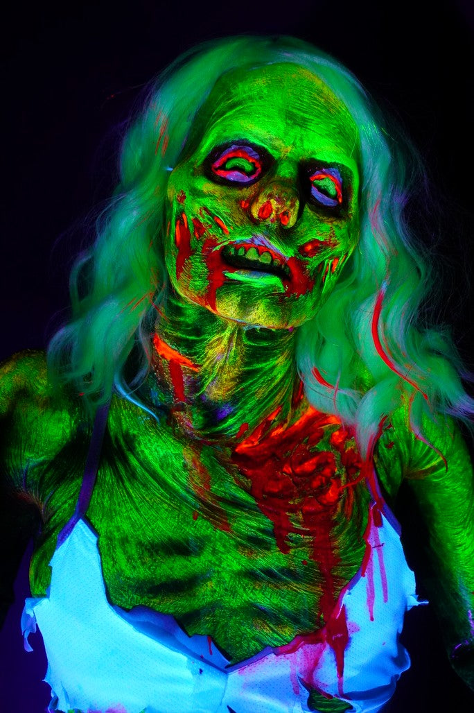 Lifesize standing female ghoul with base plate and removable leg stands. Cast in glow-in-the dark rubber and painted with blacklight responsive paint to create multiple types of glowing effects. The pic with the gray background shows the ghoul under normal light, the purple tinged photo shows the ghoul under blacklight, and the black photo shows the ghouls in no light with just the green glow of the glow in the dark rubber.