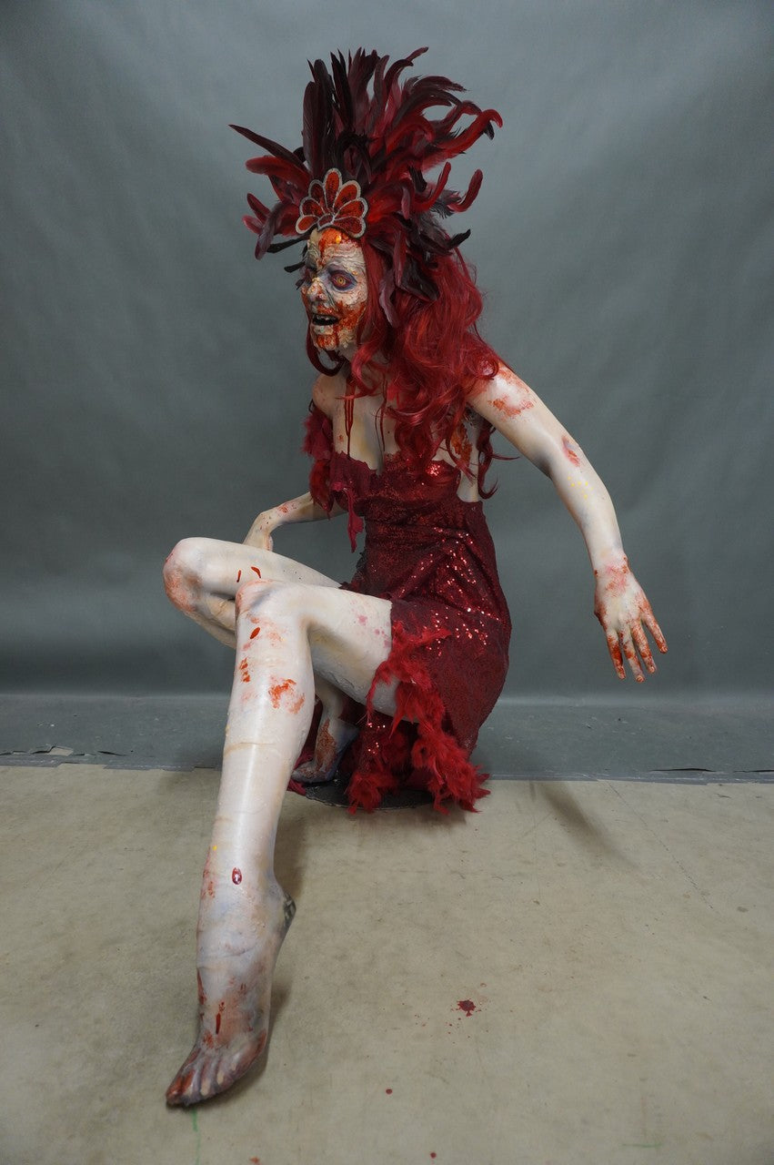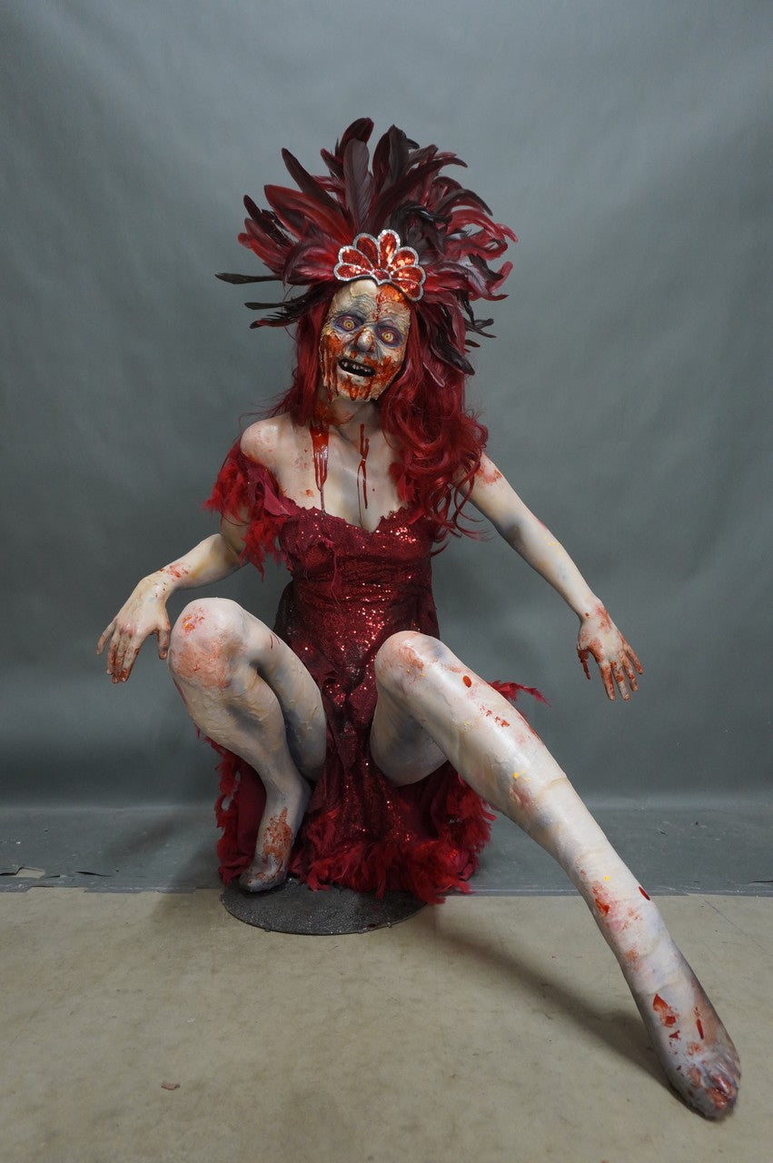 Crouching lifesize zombie Molly is distressed showgirl costume. Features full detail rubber upper body with semi-poseable arms and neck and removable fiberglass legs that serve as the base.